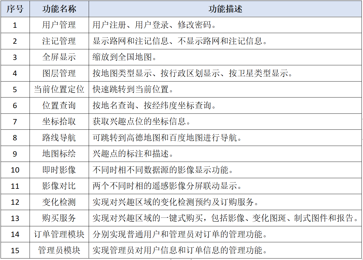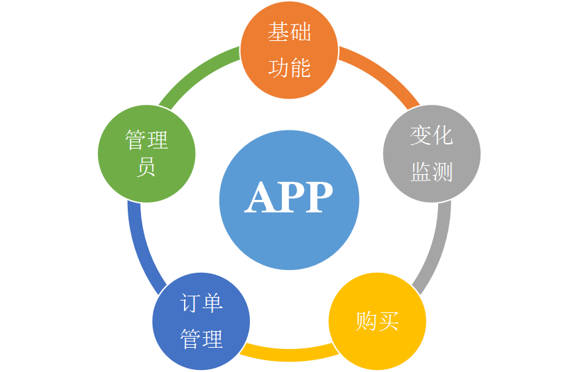 智星慧眼APP主要由基础功能模块、变化监测模块、购买模块、订单管理模块、管理员模块5大功能模块构成。