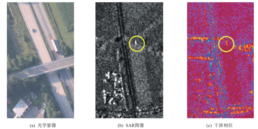 影像成像与强度应用是SAR影像的基本工作模式,单幅SAR影像数据主要是应用于地物分类以及目标识别,强度特征则是SAR影像最主要的特征之一,基于SAR强度影像可以提取地物信息。SAR可以根据物体的物理化学性质差异,辨别各种地形、地貌特征,对于地质领域的填图以及地震带的确认工作有较大帮助。在目标识别上,SAR 可进行海上的船舶监测和识别、溢油探测、陆地车辆等移动目标监测。地面慢速运动目标的检测与成像也是SAR卫星影像的国防之一。通过建筑物的叠掩和阴影,SAR可以对建筑物的三维信息进行提取,并在一些突发地灾后对建筑损毁状况、滑坡、堰塞湖等进行受灾前后的对比评估。SAR还可以结合高程数据进行精确的坐标定位。