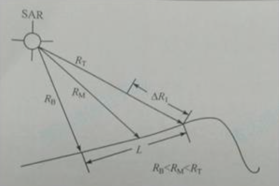 当雷达波束到斜坡的顶部、中部和底部的斜距分别为R、Ry、和Rg,由于R产>Rw>RB,雷达波束先照射到坡底,然后才照射到坡顶,坡底先成像,坡顶后成像,该斜坡的斜距显示在图像上的距离为△R,△R,显然小于实际坡长L。因此,斜坡的长度在图像上被缩短了。