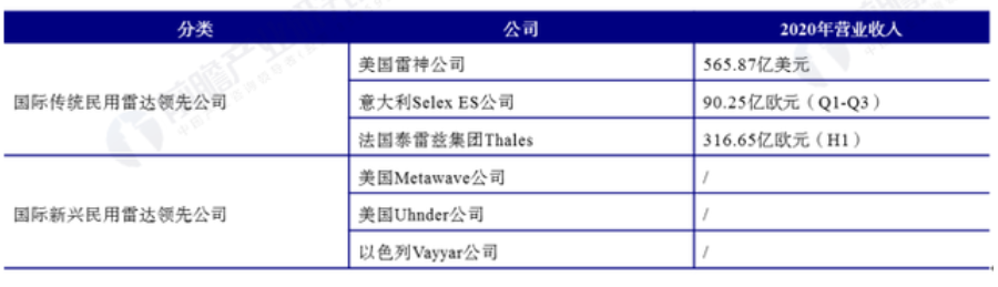在全球方面,民用雷达行业主要由国际传统民用雷达领先公司和国际新兴民用雷达领先公司构成;其中,国际传统民用雷达领先公司主要以美国雷神公司、意大利Selex ES公司、法国泰雷兹集团Thales等企业为龙头,而国际新兴民用雷达领先公司则是以美国Metawave公司、美国Uhnder公司、以色列Vayyar公司等为龙头企业。