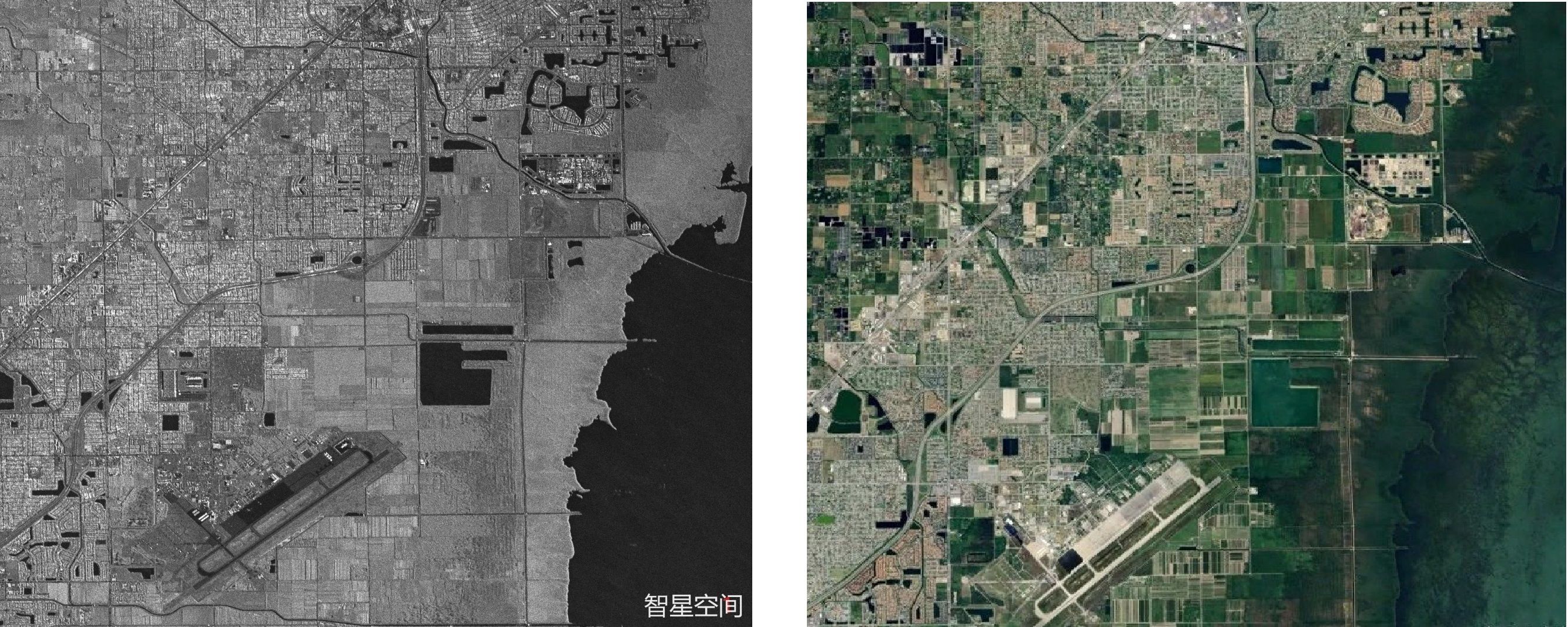 某区域智星二号A星(SAR)成像(下图左)和光学遥感影像(下图右)对比展示如下: