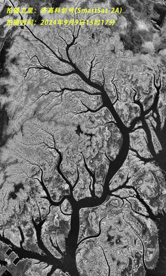 SAR(合成孔径雷达)卫星拍摄的红树林湿地图像,与光学卫星拍摄的图像不同,它利用微波来穿透云层和植被,捕捉地表和结构特征。因此,SAR卫星图像呈现出红树林湿地独特的纹理和形态,SAR影像中的红树林湿地通常表现为不规则的高反差纹理,这是由于红树林的复杂根系、树冠和潮汐沟壑结构对雷达波的强烈散射作用所致,湿地中水体、泥沙和植被混合的区域会反射出不同的亮度,显示出复杂的纹理模式。