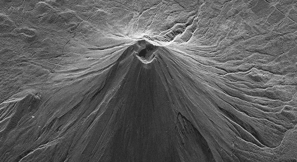 羊蹄山(Yōtei-zan)位于北海道东部,靠近函馆市,是一座休眠火山,形状类似富士山,呈现出几乎对称的锥形。由于长期未有喷发,被称为“蝦夷富士”。从卫星视角来看,羊蹄山的对称性非常显著,但由于长时间的休眠,山体较为稳定,表面出现很多的侵蚀痕迹,在SAR影像中表现出对称性与细节上的不同。羊蹄山常年覆盖积雪,尤其是冬季积雪厚重,SAR能够监测积雪厚度的变化以及对地表反射的影响。此外,冬季的雪崩风险较高,SAR还可以追踪积雪变化和滑坡迹象,确保游客的安全。