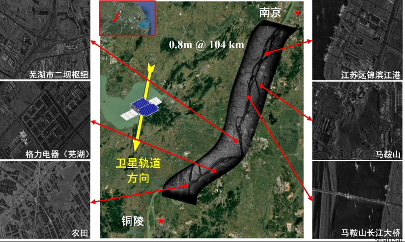 本次试验依托智星空间智星二号A星(济高科创号)进行,观测场景为南京到铜陵段的长江干流区域,星载SAR的曲线成像带匹配河道走向生成,成像方位分辨率为0.8 m(波动<3%),沿长江流域成像带长度为104 km,见下图。