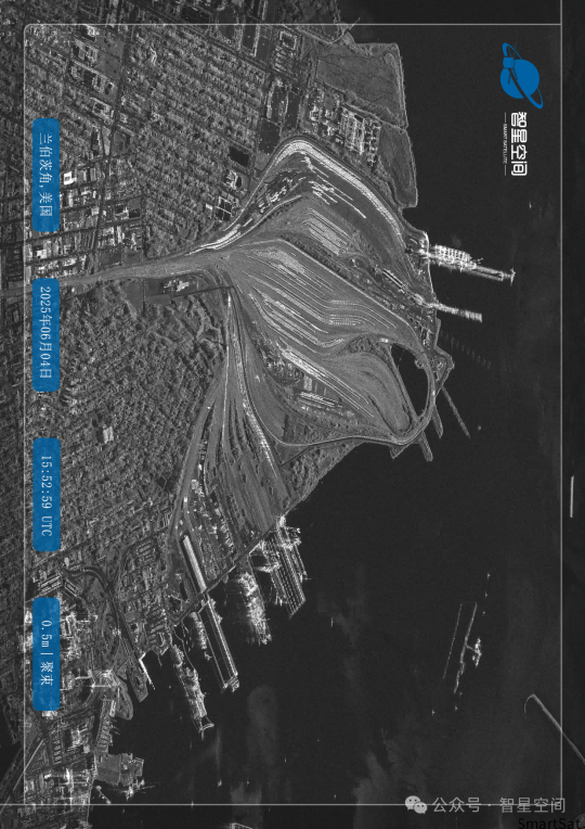 通过智星二号A星SAR影像可见,码头布局复杂而高效,铁路轨道如蛛网般密集,将煤炭源源不断运往延伸至河中的码头;大型装船机和卸船机有序作业,而SAR技术对金属的高反射特性使船只轮廓清晰可辨。