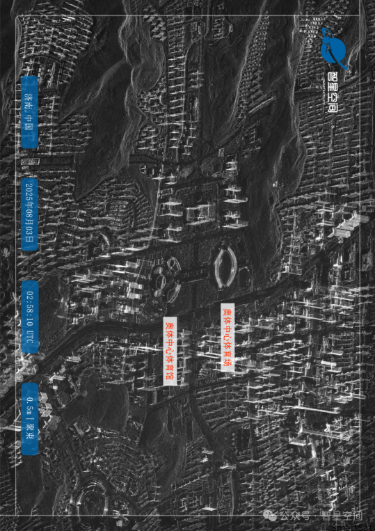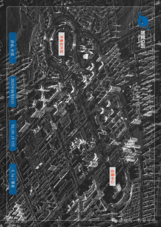 随着SAR视角的拉远,齐鲁软件园的现代建筑群在SAR影像中清晰显现。玻璃幕墙楼群对雷达波束的响应呈现出鲜明的电磁特征:当幕墙与波束近似垂直时,强烈的镜面反射使其在影像中化为异常明亮的亮线或亮斑;而当墙面倾斜或与雷达波束夹角较大时,雷达波散射至其他方向,对应区域则呈现暗色甚至无信号的“暗斑”。这与开阔广场、规则道路及低反射植被形成强烈对比,明暗交织的图案,勾勒出园区的几何轮廓。视线沿舜华路延伸,济南国际会展中心跃入画面。