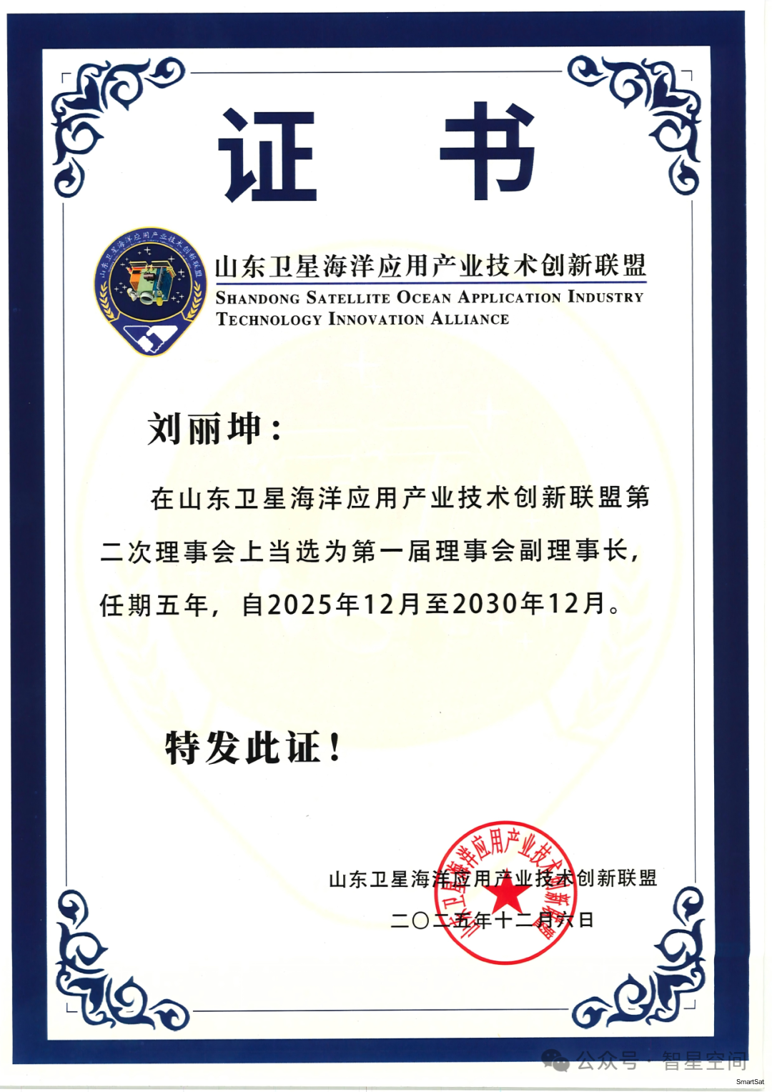2025年12月6日,山东卫星海洋应用产业技术创新联盟第二次理事会暨空天技术应用创新产业发展推进会在山东威海蓝科大厦召开。会议开展了联盟副理事长(单位)推选工作,经联盟理事会审核决定,济南智星空间科技有限公司成为联盟的副理事长单位,公司董事长刘丽坤当选为第一届理事会副理事长,济南公司负责人刘清波聘任为理事会副秘书长。 刘丽坤在做任职发言时表示:在联盟的引领下,结合本公司在星载和机载合成孔径雷达方面的工程能力,坚持创新驱动、 坚持应用牵引、 坚持责任为先,与联盟各位同仁共同书写卫星海洋应用的齐鲁答卷,为服务国家海洋强国战略贡献力量!