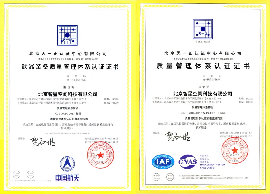 近日,智星空间通过积极贯彻“创造领先,追求卓越”这一质量方针,顺利通过专家评审,获得GJB9001C-2017武器装备质量管理体系认证和ISO9001:2015质量管理体系认证。双质量管理体系认证进一步规范了企业管理,具有里程碑意义。